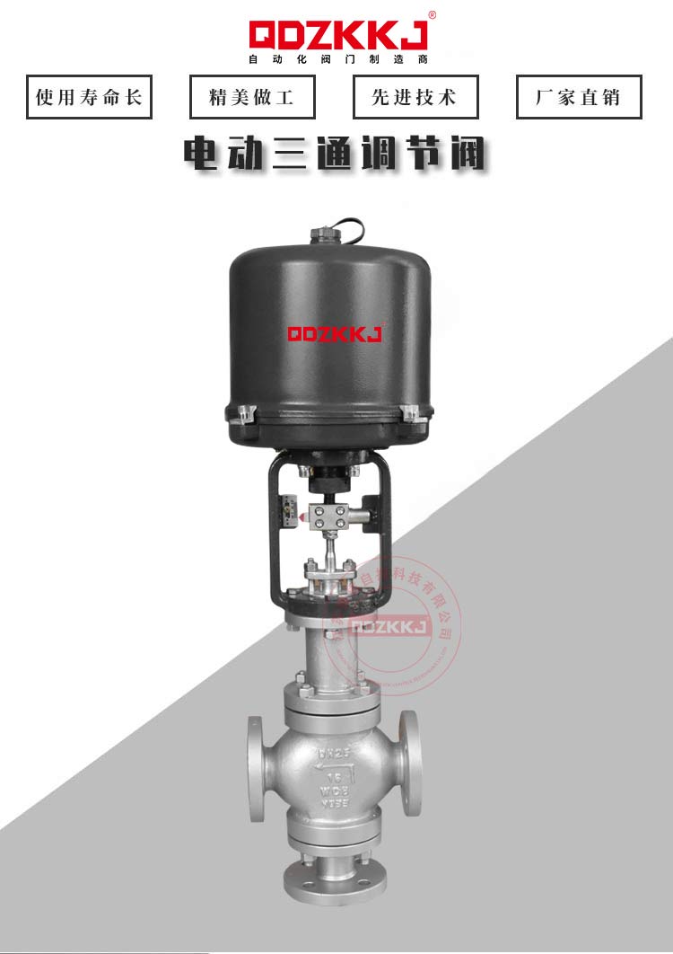 本公司的電動三通調節閥是由PSL系列和3810系列直行程電動執行機構和三通調節閥體組成。電動執行機構為電子式一體化結構,內有伺服放大器,輸入控制信號(4-20mADC或1-5VDC)及電源即可控制閥門開度,達到對壓力、流量、液位、溫度等工參數的調節。電動三通調節閥具有動作靈敏、連線簡單、流量大、體積小、調節精度高等特點。控制精度和性能比DKZ型有明顯提高。電動三通調節閥具有調節精度高,動作穩定可靠等優點。電動三通合流調節閥主要用于將兩種流體混合成第三種流體;電動三通分流調節閥主要用于將一股流體分成兩股流體。電動三通調節閥產品可代替兩臺互為開關的單、雙座調節閥,用于液體、氣體、蒸汽等介質的調節與控制。